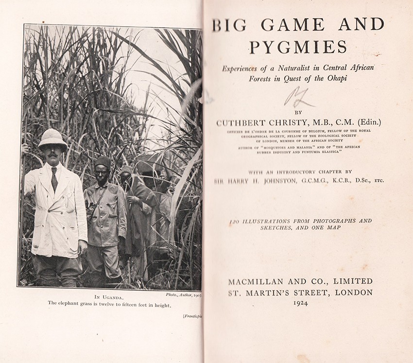 Czech (K.) An Annotated Bibliography of African Big Game Hunting Books 1785-1999 (new edition 2011), page 61: A scientist by profession, Christy hunted throughout the equatorial region along the Ituri River in the Belgian Congo, the Katanga District, in Uganda and the Lado Enclave. He bagged elephant, buffalo, lion and bongo and was the first European to track and shoot an okapi.
