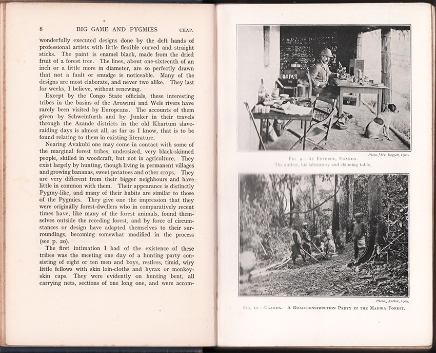 325 pages, frontispiece of the author in Uganda, 120 photographic illustrations, folding map repaired with tape and starting to tear again, original blue cloth, spine gilt and frayed at the bottom, corners bumped, foxing on page edges, book plate on front paste-down endpaper, cancelled ownership plate and ticket of the Times Book Club on the back paste-down end paper.