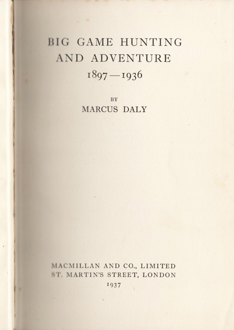 Czech (Dr Kenneth) An annotated Bibliography of African Big Game hunting Books, 1785 to 1950, page, 73, 'With a career spanning nearly four decades, Daly hunted big game in various parts of Africa. Included are elephant hunts in Kenya and the Congo in the area of Tanaland and the Lower Wakamba, lion in Matabeleland, as well as safaris to French Equatorial Africa, the Sudan and Cameroons for all manner of game including gorilla. H maintains that of elephant, buffalo and rhinoceros, all are equally dangerous depending on what and where they are met. He includes interesting chapters on why game is disappearing, and on rifle selection and shooting.'