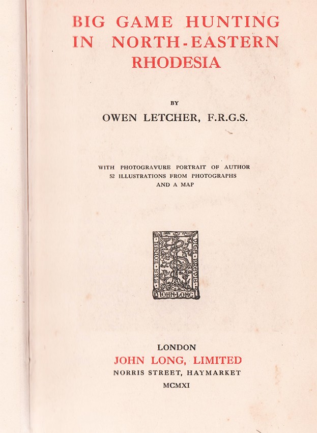 Czech (Kenneth) An Annotated Bibliography of African Big Game Hunting Books 1785-1999 page 164, ‘Letcher hunted in the Luangwa Valley for elephant, buffalo, lion, leopard, eland, and other game. After crossing the Muchinga Mountains, he bagged rhinoceros and elephant as well as roan. He continued his hunt in the swamplands near Lake Bangweulu, then returned to the Luangwa Valley for additional sport. Letcher also mentioned the chimpakwe, the “Brontosaurus” or similar prehistoric beast that natives described living near Lake Bangweulu. He concludes his book with descriptions of the types of game encountered in the area.’