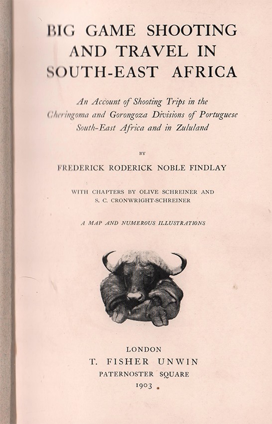 Czech (Dr. Kenneth) An Annotated Bibliography of African Big Game Hunting Books 1785 – 1999, page 95 -96: Findlay trekked through the virtually unknown recesses of the vast swamp and forest lands of Portuguese Southeast Africa and along the Urema and Massarara rivers. The game encountered included buffalo, waterbuck, hartebeest, lion, leopard, reedbuck, and other game. He then travelled to Zululand and bagged black rhino, buffalo, kudu, hippo, and inyala near the Manzibomvu River. Findlay also describes a springbok and ostrich hunt in the karoo country of Cape Colony. Though an ardent sportsman, he also realized the limits of wild game in Africa and argues for the preservation of habitat and maintaining healthy numbers of game animals.
