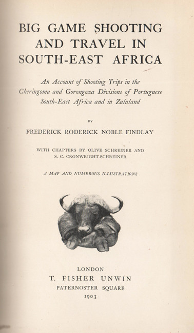 Czech (Dr. Kenneth) An Annotated Bibliography of African Big Game Hunting Books 1785 – 1999, page 95 -96: Findlay trekked through the virtually unknown recesses of the vast swamp and forest lands of Portuguese Southeast Africa and along the Urema and Massarara rivers. The game encountered included buffalo, waterbuck, hartebeest, lion, leopard, reedbuck, and other game. He then travelled to Zululand and bagged black rhino, buffalo, kudu, hippo, and inyala near the Manzibomvu River. Findlay also describes a springbok and ostrich hunt in the karoo country of Cape Colony. Though an ardent sportsman, he also realized the limits of wild game in Africa and argues for the preservation of habitat and maintaining healthy numbers of game animals.