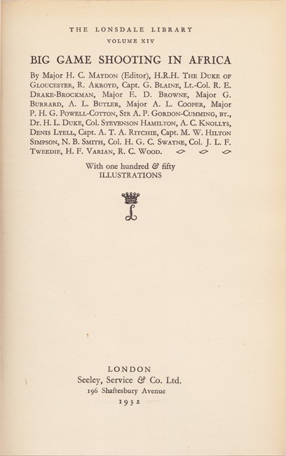 Czech: An annotated Bibliography of African Big Game hunting Books, 1785 to 1999, pages 187/8, ‘An essential title in the African big game library, this work calls on the talents of numerous African sportsmen as contributors describing the hunting regions of the continent with attendant analysis of game animals and hunting methods. The contributors include Maydon; the Duke of Gloucester; R, Akroyd; G. Blaine; R.E. Drake-Brockman; P.H.P. Powell-Cotton; Stevenson Hamiltin; G.C. Swayne; H.F. Varian; and others.’