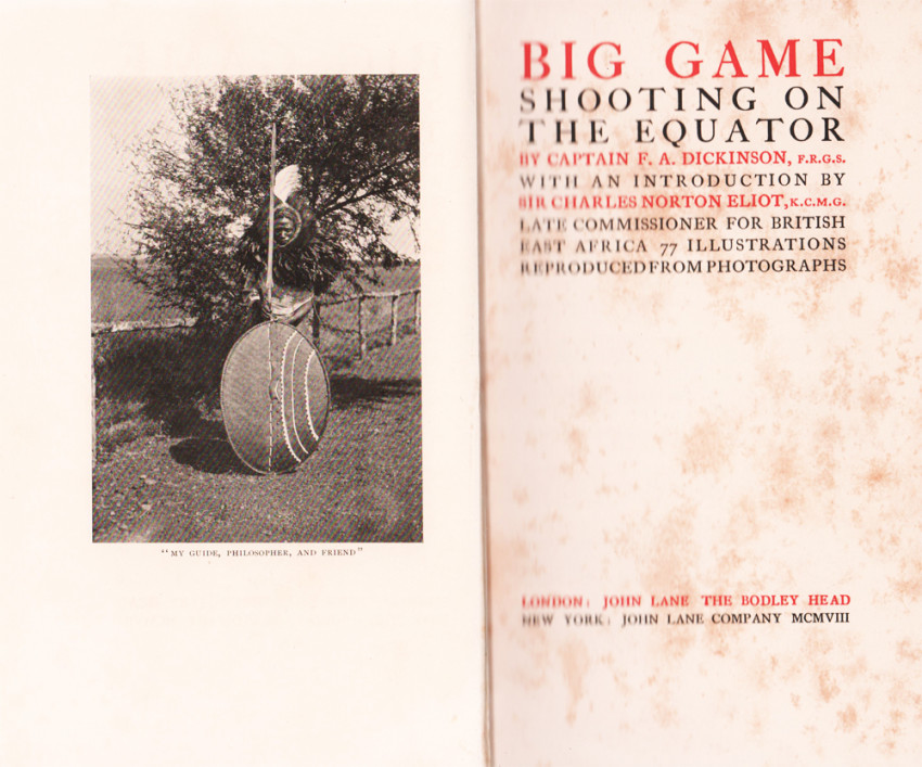Czech (Kenneth)An Annotated Bibliography of Big Game Hunting Books 1785 - 1999 page 81:‘Dickinson’s approach is systematic, describing the haunts of each major species of wild game in East Africa including lion, kudu, oryz, eland and other plains game, particularly near the Guaso Nyiro and the Tana River. There is an excellent chapter on stalking buffalo accompanied by some marvellous photos of the author hunting a wounded buffalo in the swamp regions near lakes Solai and Baringo.’