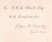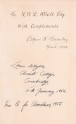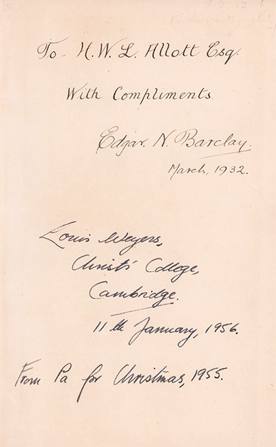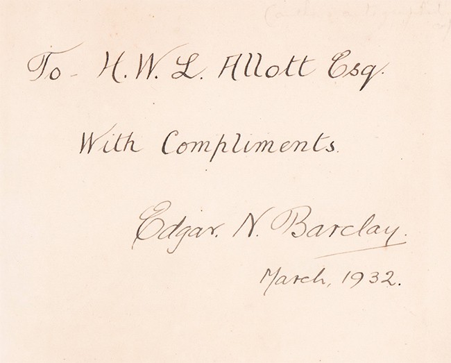 Presentation inscription by the author to H.W.L. Allot dated March 1932 on the front free end paper.