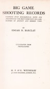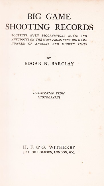 Czech (Kenneth) AN ANNOTATED BIBLIOGRAPHY OF AFRICAN BIG GAME HUNTING BOOKS 1785 -1999 Page 18: Barclay examines the major game of the world including Africa, with brief biographical notes concerning some of the most famous hunters of the 19th and early 20th centuries. There are chapters on elephant, rhino, buffalo and lion. Among the sportsmen in focus are James Sutherland, Arthur Neumann, W.D.M. Bell, Frederick Selous, William Finaughty, Petrus Jacobs and Roualeyn Gordon Cumming and others.