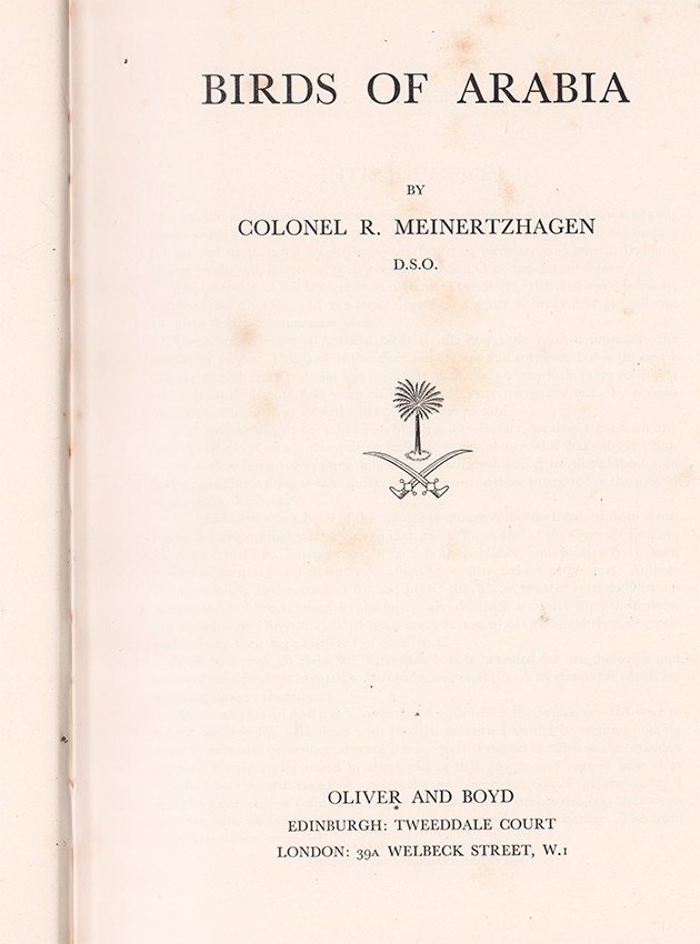 Colonel Richard Meinertzhagen, CBE, DSO (3 March 1878 - 17 June 1967) was a British soldier, intelligence officer and ornithologist. He had a decorated military career spanning Africa, where he was credited with creating and executing the infamous Haversack Ruse. While early biographies lionized Meinertzhagen as a master of military strategy and espionage, later works such as Brian Garfield's The Meinertzhagen Mystery present him as a fraud for fabricating stories of his feats. The discovery of stolen museum bird specimens resubmitted as original discoveries had raised serious doubts on a number of scores as to the veracity of ornithological records he claimed as well. In 1948-49, he was accompanied by Dr. Phillip Clancey on an ornithological expedition to Arabia, Yemen, Aden, Somalia, Ethiopia, Kenya, and South Africa. As the author of numerous taxonomic and other works on birds, and possessing a vast collection of bird and bird lice specimens, he was long considered one of Britain's greatest ornithologists. Garfield claims Meinhertzhagen's magnum opus, Birds of Arabia (1954), was based on the unpublished manuscript of another naturalist, 3 George Bates, who has been insufficiently credited in the work. https://en.wikipedia.org/wiki/Richard_Meinertzhagen