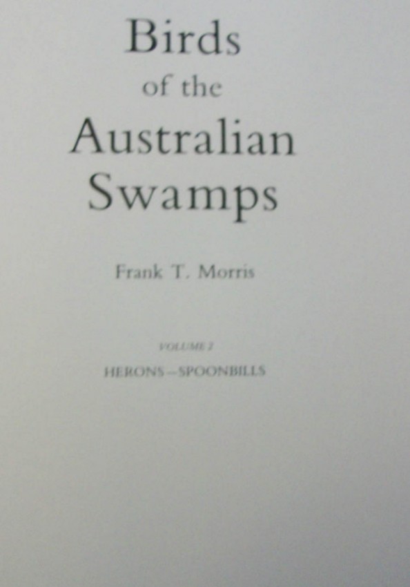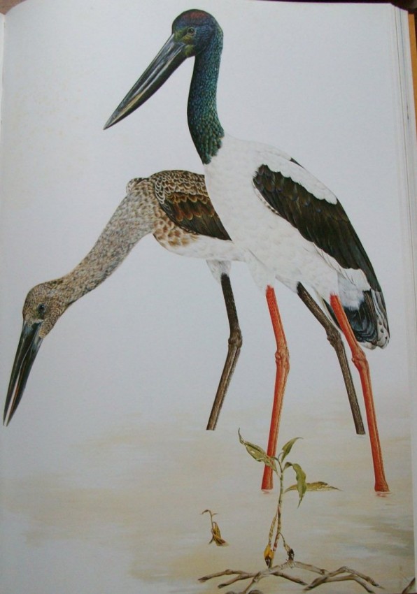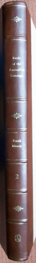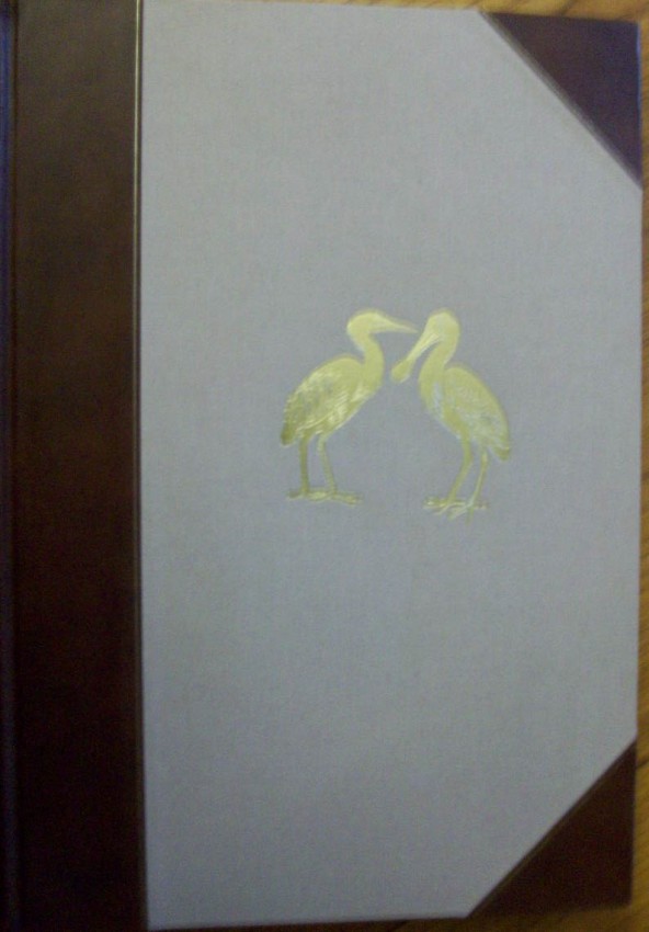 A Half brown leather bound book with gilt lines where leather reaches matching beige cloth boards.Bright gilt Heron & Spoonbill vignette embossed to front board. Six raised ribs to leather spine with decorations. Bright orange endpapers as published.