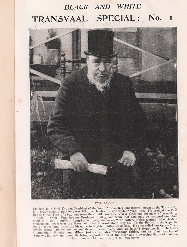 Jingoistic mass circulation weekly priced at two pence per copy and aimed at the newly literate lower middle class it was immediately successful. By issue number 17, February 3, 1900 the circulation had grown to 520,000 copies and by February 27, to 600,000 and the claim is made that, 'placed end to end last week's issue reached from London to Bournemouth.' The flavour of the journalism can been seen from the following description of President Kruger, '...He once called our Queen "een kwaje vrouw" (which neither sounds nor means nice), and we haven't forgotten it. He hates Chamberlain, Rhodes and Milner, just as he hates everything British, and he often preaches o' Sundays, his sermons generally being a glorification of the Boer and a sweeping damnation of the Briton. For an old man, he ought to know better.' It is profusely illustrated throughout with photographs and sketches by war artists.