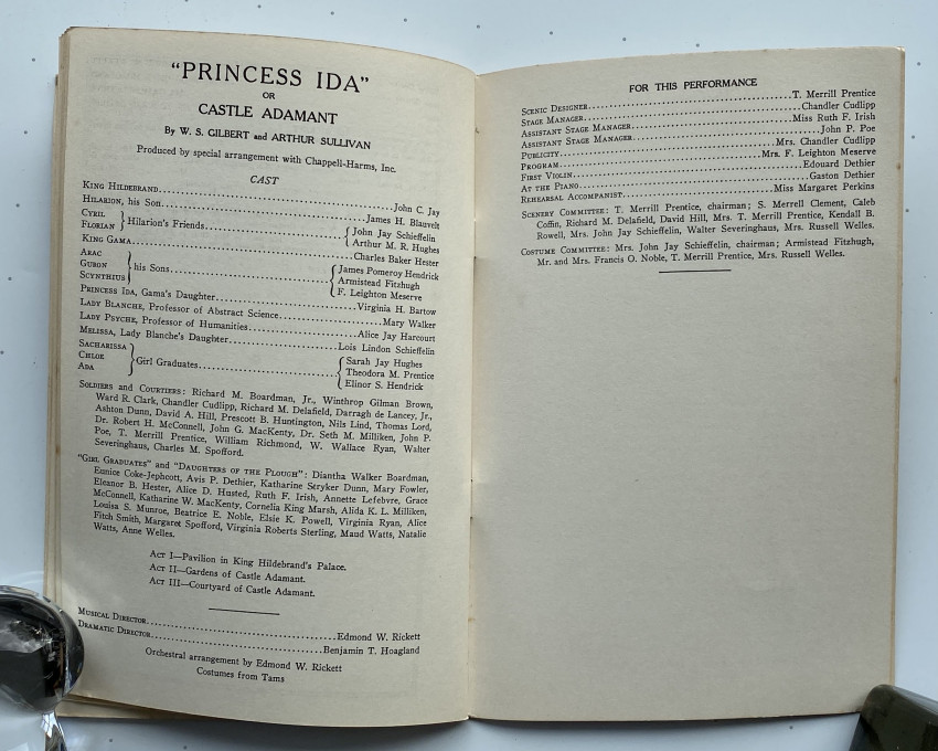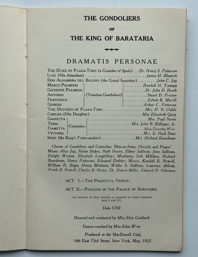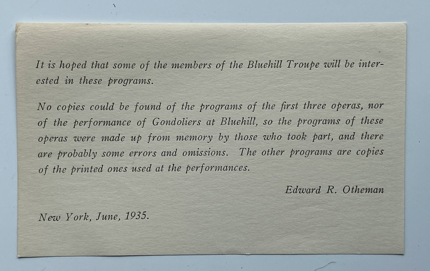 No copies could be found of the programs of the first three operas, nor of the performance of the Gondoliers at Bluehill, so the programs of these operas were made up from memory by those who took part, and there are probably some errors and omissions. The other programs are copies of the printed ones used at the performances. Edward R. Otheman. New York, June, 1935”