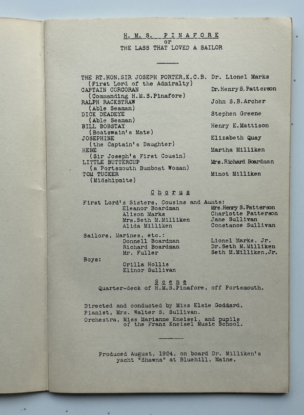 “The Blue Hill Troupe was born the summer of 1924, when Dr. and Mrs. Seth Milliken decided to try and protect their children from the dangerous influences of the Roaring Twenties by having them put on a production of HMS Pinafore. That first Troupe Pinafore was performed on the deck of the Millikens’ yacht, lit from land by automobile headlights and accompanied by music school students, perched with piano and violins on a nearby yacht.