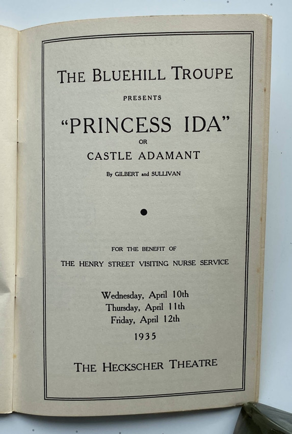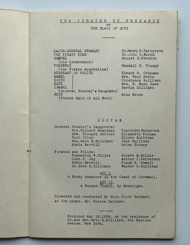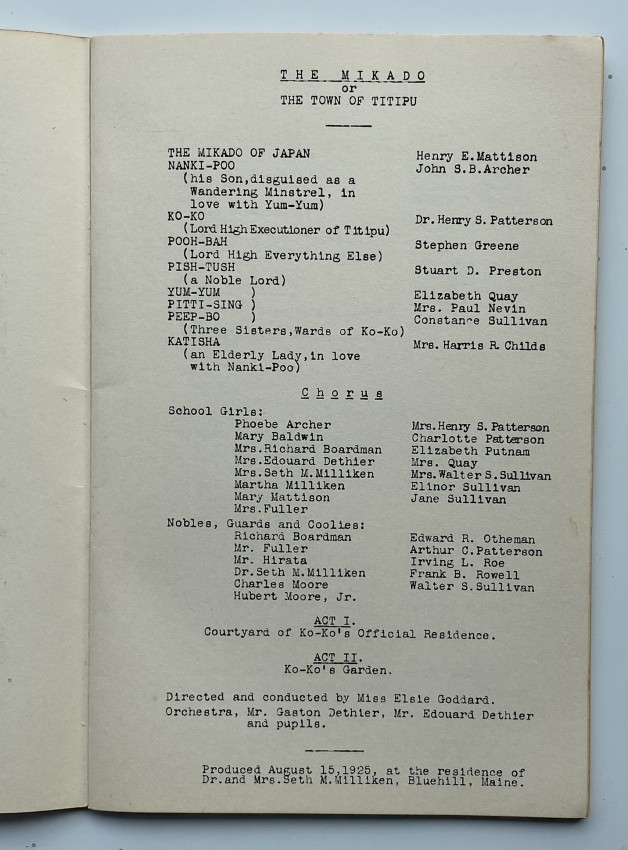 [GILBERT & SULLIVAN]. – [Dr. Seth Minot MILLIKEN (1875 -1957) & Alida King MILLIKEN (1879-1975)]. [Blue Hill Troupe. Cover title:] Bluehill [sic.] Troupe Programs 1924-1935. [No place but New York ?: privately printed?, no date but c. June 1935]. Octavo ( 8 ½ x 5 ½in; 216 x 140mm). [pp.1-40 (including final blank)], + a small format printed slip is loosely inserted. Stapled into wrappers (light soiling, see images). Provenance: T. Merrill Prentice (1898-1985, estate sale purchase).