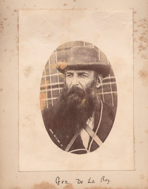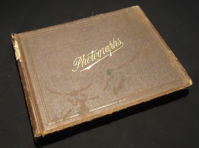 Each mounted on thick card leaves with linen hinges in a album bound in maroon pebble-grained cloth and titled Photographs in gilt on the upper cover. The cloth is damaged on the spine and worn around the edges.