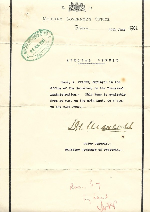 1. Typed pass on the letterhead of the Military Governor's Office, dated 20th. June, 1901 and signed by Major General John Grenfell Maxwell, the Military Governor of Pretoria. 33x21cms.