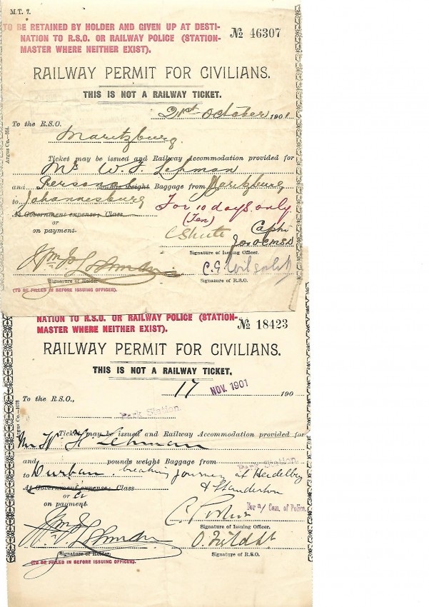 2. & 3. Two printed and hand completed and signed Railway Permits for Civilians dated 21st. October 1901 & 17 November 1901. 14x16cms.
