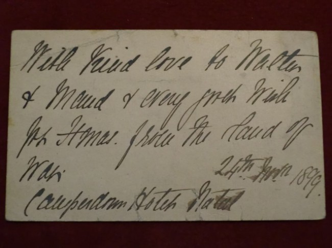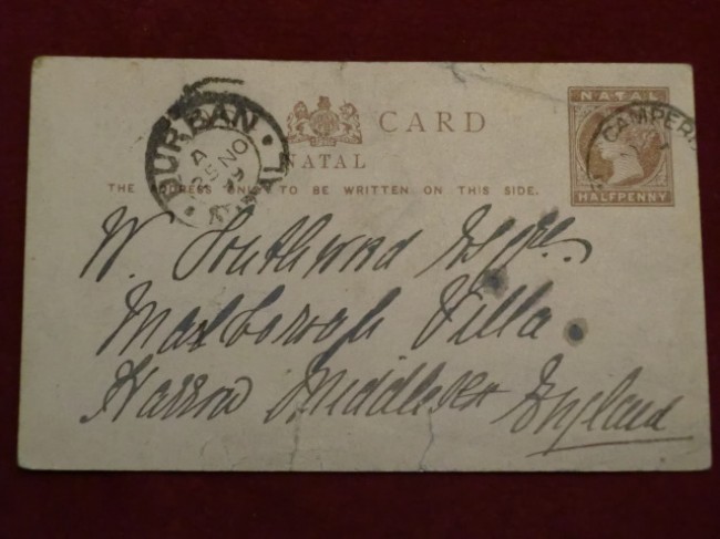Original postcard with preprinted 'Natal Halfpenny' (franked 'Camperdown' at top right), dated 25 November 1899 at top left. Addressed to: 'W.Southward, Esquire, Marlborough Villa, Harrow, Middlesex, England' the message on the reverse reading: "With kind love to Walter & Maud & every good wish for Xmas, from the land of War. 24th Nov.1899" - Camperdown Hotel, Natal.