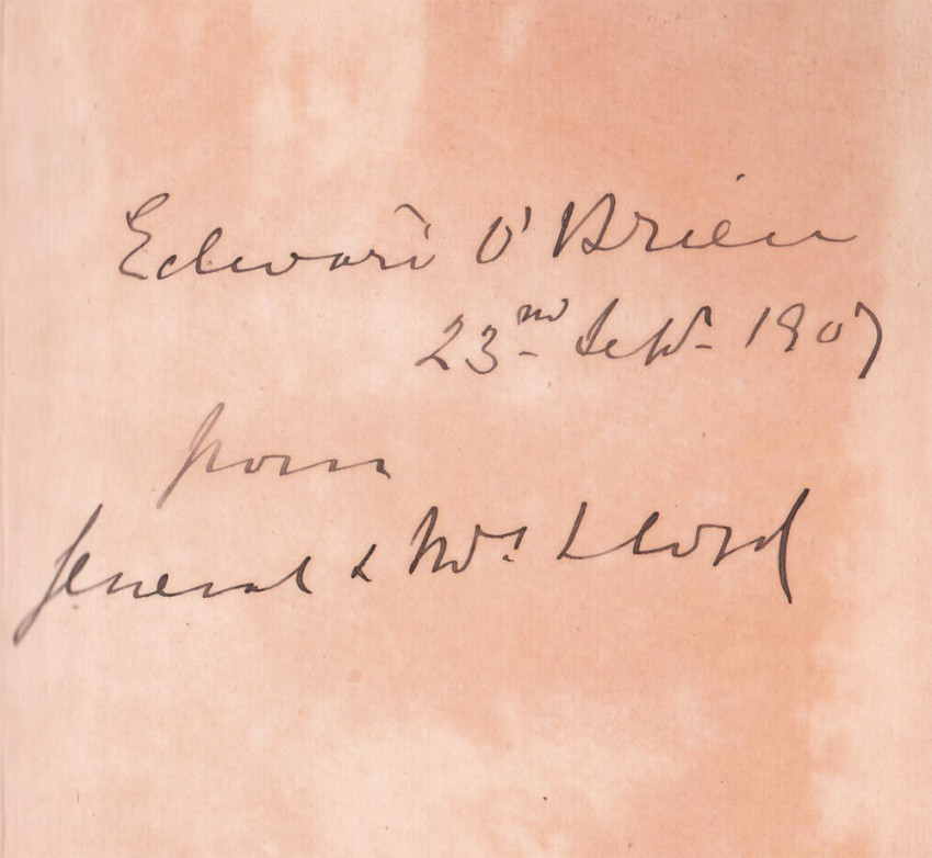 Inscription on the front free end paper reads: Edward O’Brien 23rd Sept.1907 from General and Mrs Lloyd.