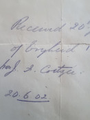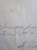 Handing over Arms receipt. A 20x16cm receipt featuring embossed Royal Coat of Arms, dated 20 June, 1902 and signed by a Captain and Staff Officer. "Received 20th June 1902 from HJ Potgieter of Vryheid, 1 Mauser rifle + 3 Lee Metfords from JF Coetzee". See LOT 441