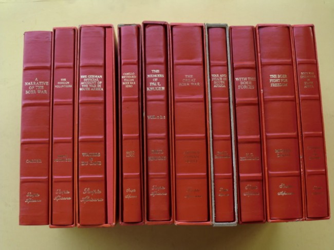 10 volumes of the 11 volume set bound in attractive red leather with gilt titles, lacking only 'Three Years War' by C.R.De Wet. All volumes in excellent (virtually unopened) condition, one without a slipcase, and another not in original slipcase. This is set #670 of 1000. The volume lacking a slipcase is: 'A Narrative of the Boer War' by Thomas Fortescue Carter, and is in excellent condition except for a stained fore-edge (splash marks).