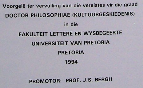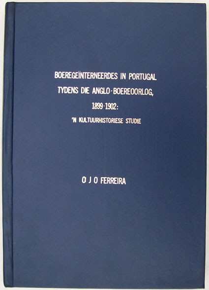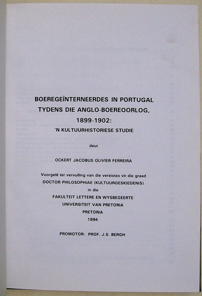 This is a copy of Ferreira's Doctoral Thesis submitted to the University of Pretoria in 1994 and precedes the books: A first edition, "Viva Os Boers! Boeregeinterneerdes Tydens die Anglo Boereoorlog 1899-1900" limited to 350 copies in 1994 and the paperback reprint edition of 2000.