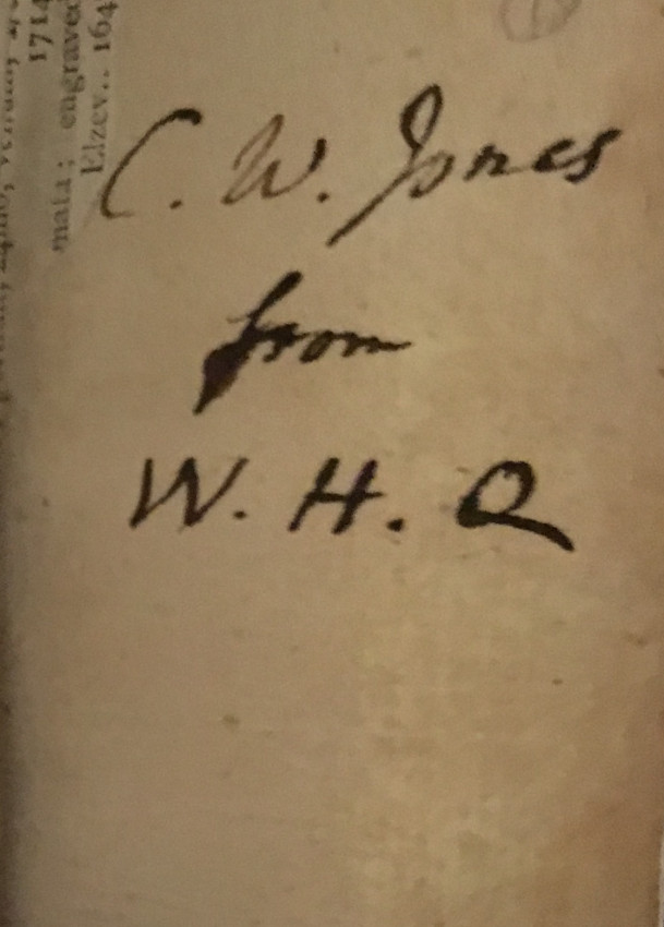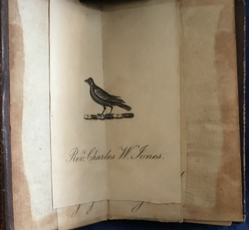 Rev. Charles W. Jones’ engraved bookplate (blackbird emblem) pasted over an earlier plate, adhered to both cover and ffe. Inscribed on blank, “C. W. Jones from W. H. Q.” (most likely William Hollingsworth Quayle, Jones' uncle.) Charles William Jones, ordained in 1849, followed his father in becoming Vicar of Pakenham, a position he held from 1861 to 1904. (See: THE VICARS OF PAKENHAM. BY REV. CHARLESWILLIAM JONES, M.A., Suffolk Institute online.)