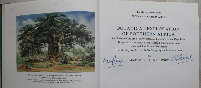 400 pages, colour frontispiece - painting of a baobab by Thomas Baines, illustrated throughout, green cloth, a very good copy in the dust jacket. (The dust jacket is covered with adhesive clear plastic).