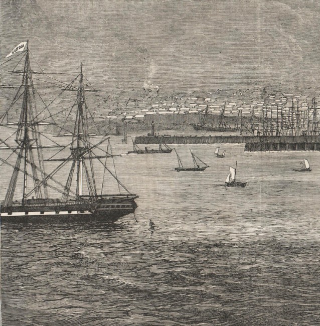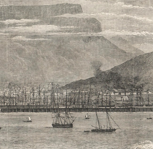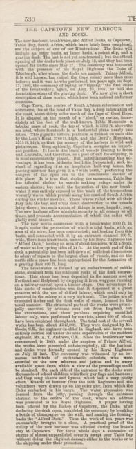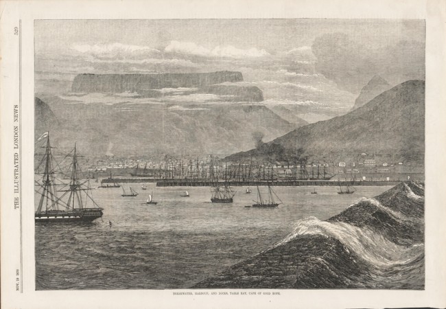 Full page wood engraved print from the ILN, November 19, 1870. Page 529. An article on the back (page 530) describes The Capetown New Harbour and Docks.