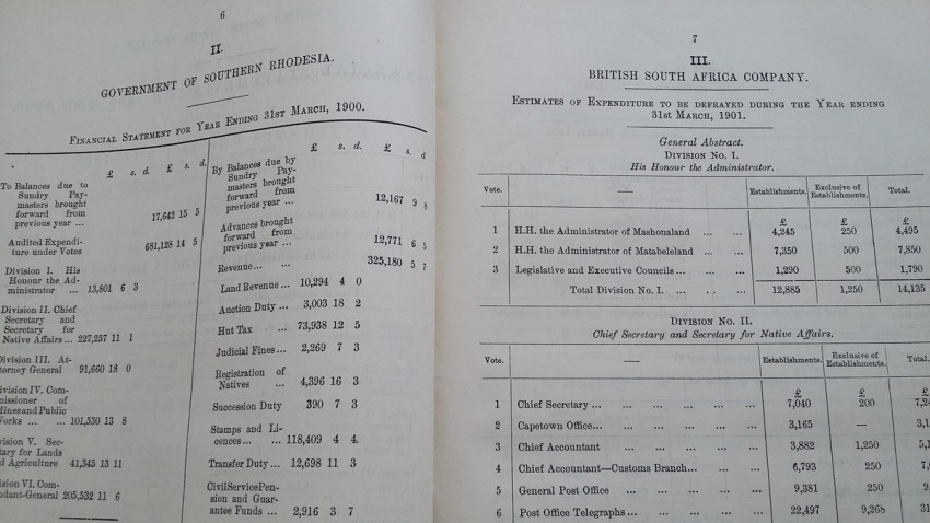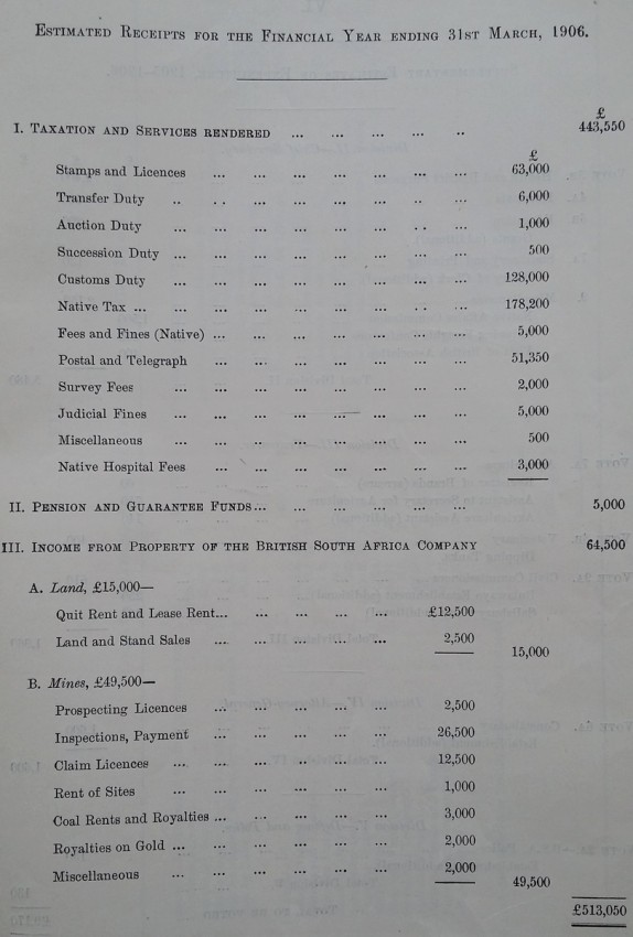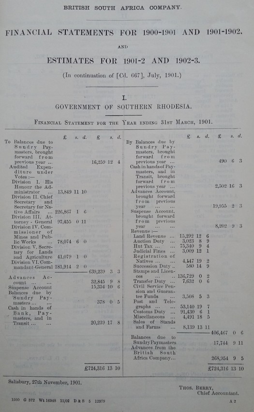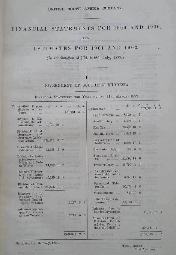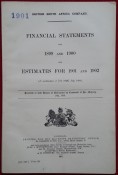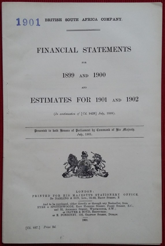 - Financial Statements for 1899 and 1900 and estimates for 1901 and 1902.; London: Printed for Her Majesty's Stationery Office, by Eyre and Spottiswoode, 1901; British Parliamentary Paper Cd.667.; Paper wrappers; Collation complete - 16 pages.