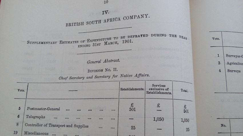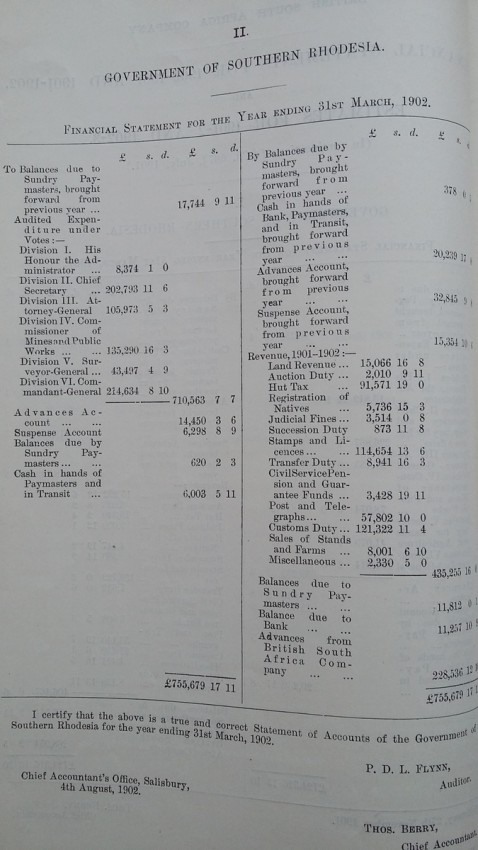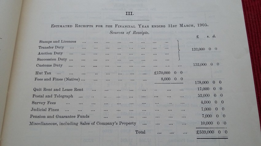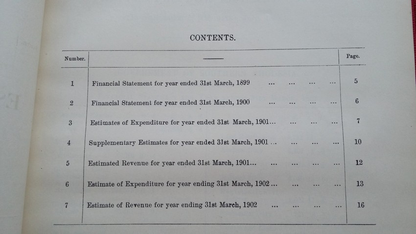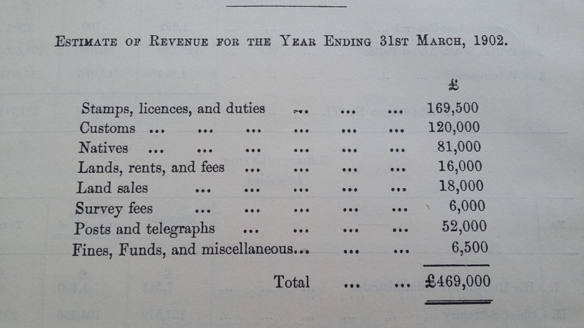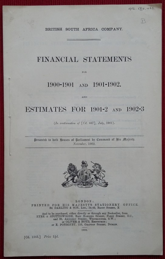 - Financial Statements for 1900-1901 and 1901 and 1902 and estimates for 1901-2 and 1902-3.; London: Printed for His Majesty's Stationery Office, by Darling & Son, 1902; British Parliamentary Paper Cd.1363.; Paper wrappers; Collation complete - 11 pages.