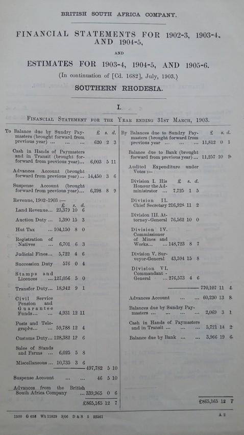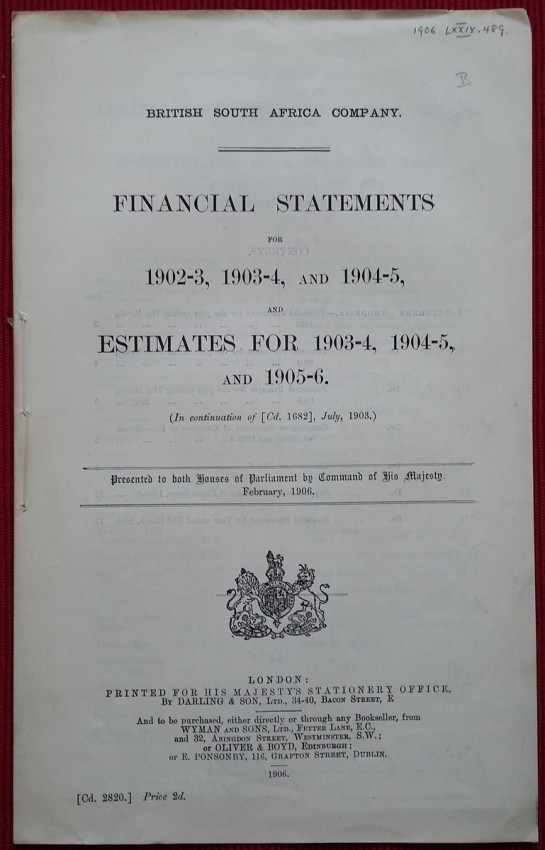 - Financial Statements for 1902-03, 1903-04 and 1904-05, and estimates for 1903-4, 1904-05 and 1905-06.; London: Printed for His Majesty's Stationery Office, by Darling & Son, 1906; British Parliamentary Paper Cd.2820.; Paper wrappers; Collation complete - 13 pages.