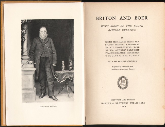 A collection of articles presenting various points of view on the Anglo-Boer War. Authors include Dr. F.V. Engelenburg (editor of the Pretoria Volkstem), A Transvaal View of the South African Question, Bryce, The Historical Causes of the Present War in South Africa, Demetrius Boulger, A Possible Continental Alliance Against England, and Karl Blind, The Transvaal War and European Opinion.
