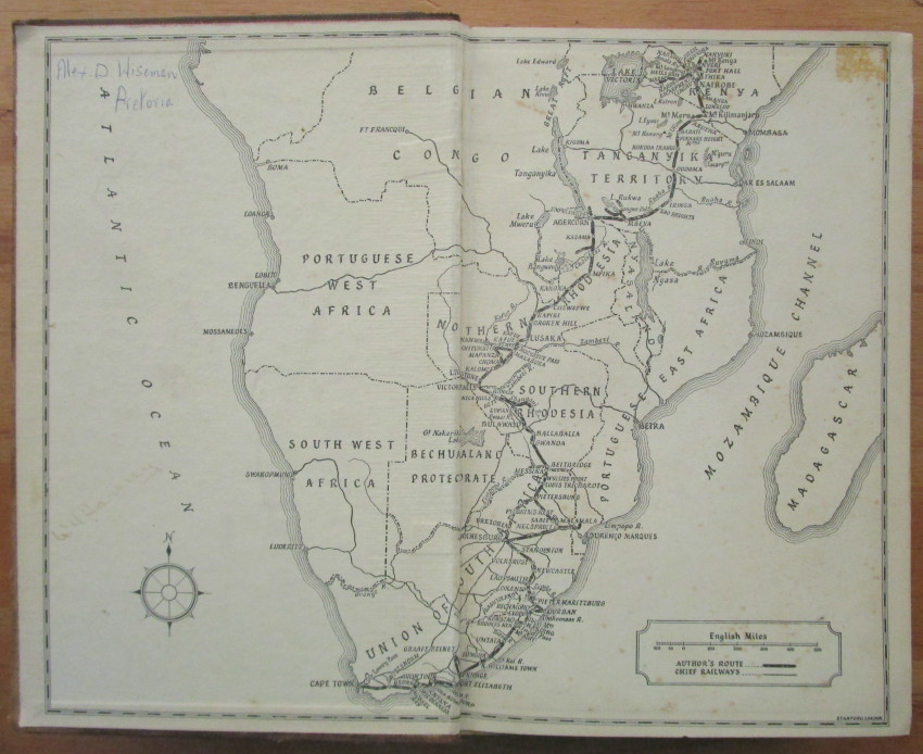 Maps to the end-papers show the author's route from Cape Town, through South Africa; Southern and Northern Rhodesia (Zimbabwe & Zambia), Tanganyika (Tanzania) and finally to Kenya.