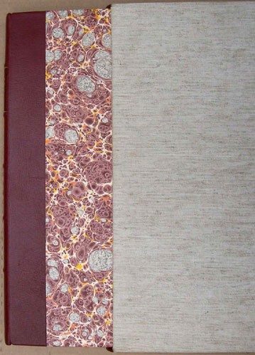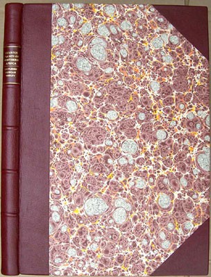 Original red leather and marbled paper binding with gilt titling on the spine housed in a slip case with matching marbled paper and leather trim. Cream coloured end papers. 192 pages, drawings, maps and 47 full page coloured plates.