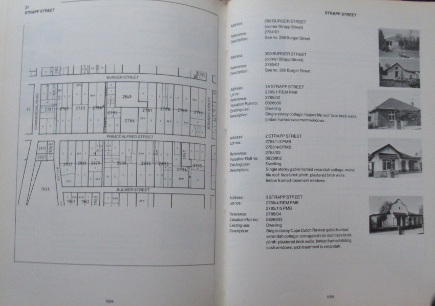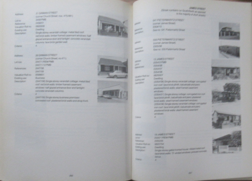Map, Title, Contents, Foreword, Introduction, From Voortrekker Dorp to Colonial Capital to South African City-The Changing Face of Pietermaritzburg, The Catalogue and how to use it,. xxvii plus 1159 pages text, with Appendices, detail and hundreds of photographs with descriptions+ large folding map to rear pocket.