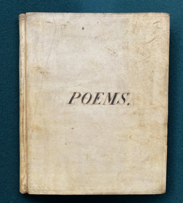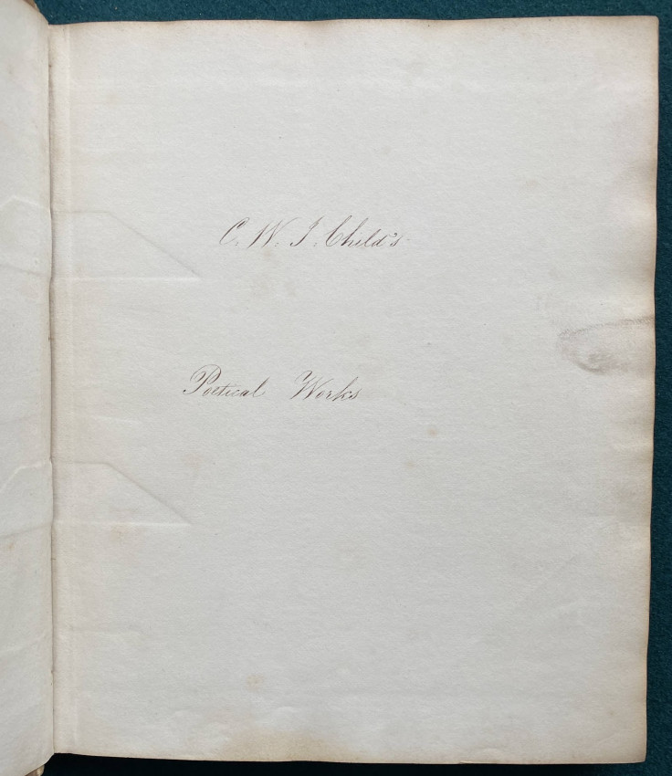 [POETRY] A 104-page manuscript, titled ‘C.W.J. Child’s / Poetical Works’. [No place, but the UK: poems dated between 1827 and 1833, but album watermarked ‘John Hall / 1829’]. Small quarto (8 7/8 x 7 ½ inches; 225 x 190mm). Pp. [1-4], '1'- '104' pages of poetry in ink in a single legible hand, some poems dated, followed by 84 lightly-ruled but otherwise blank pages. Original vellum over board, lettered in ink on the upper cover ‘Poems’ and ‘C. Child’ on the lower cover. Provenance: by descent (bought at auction).