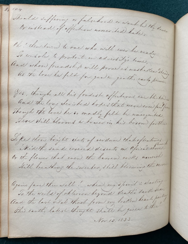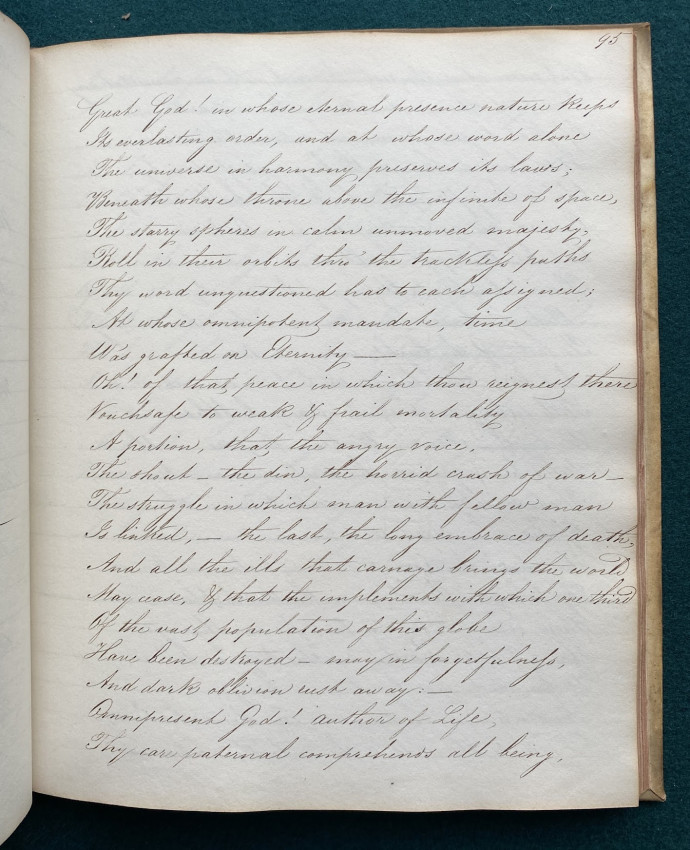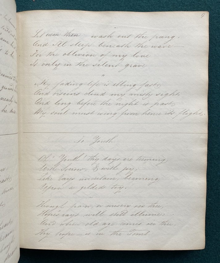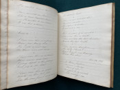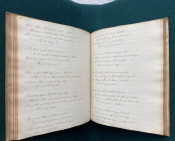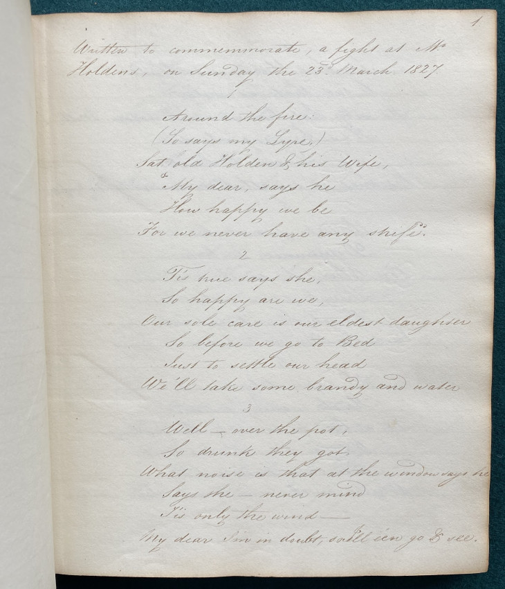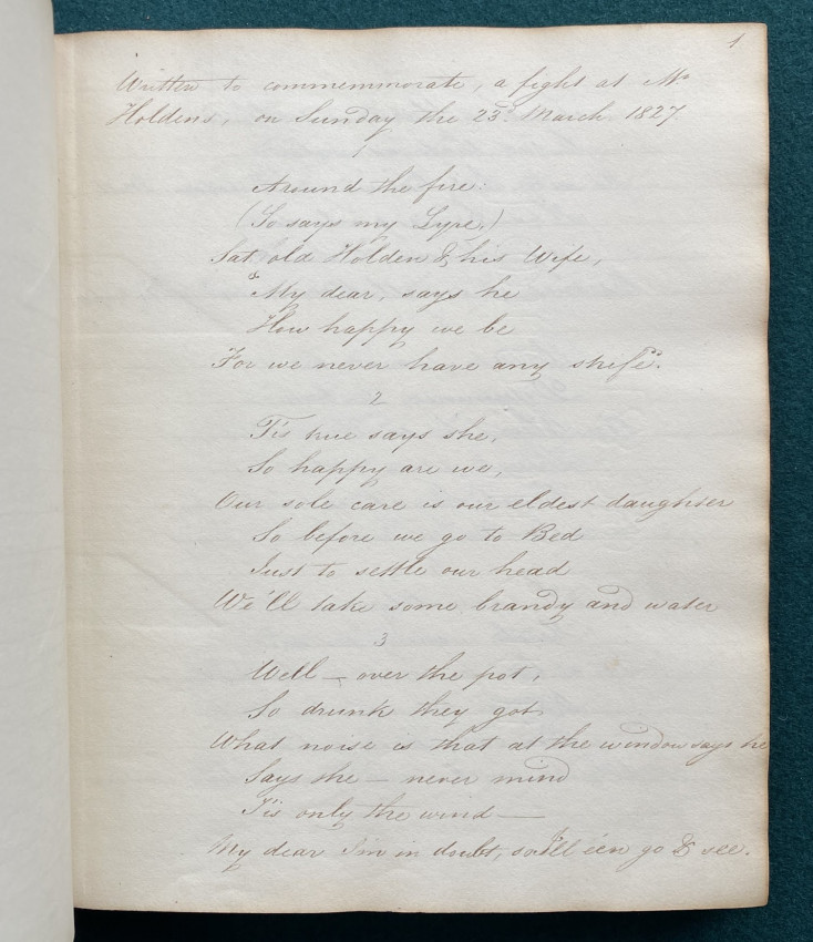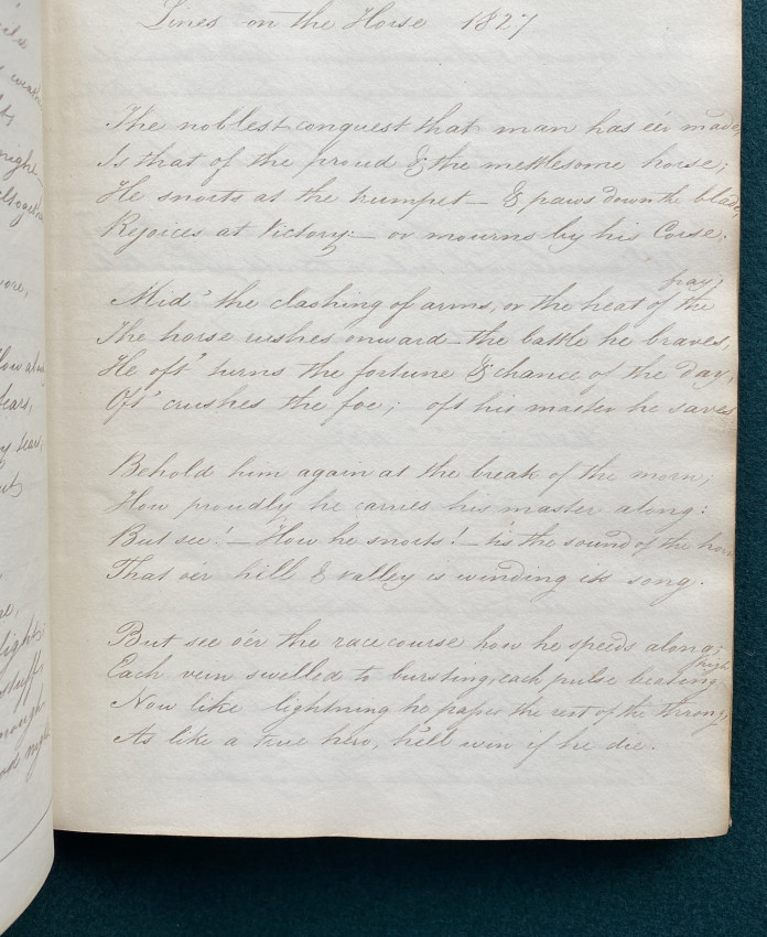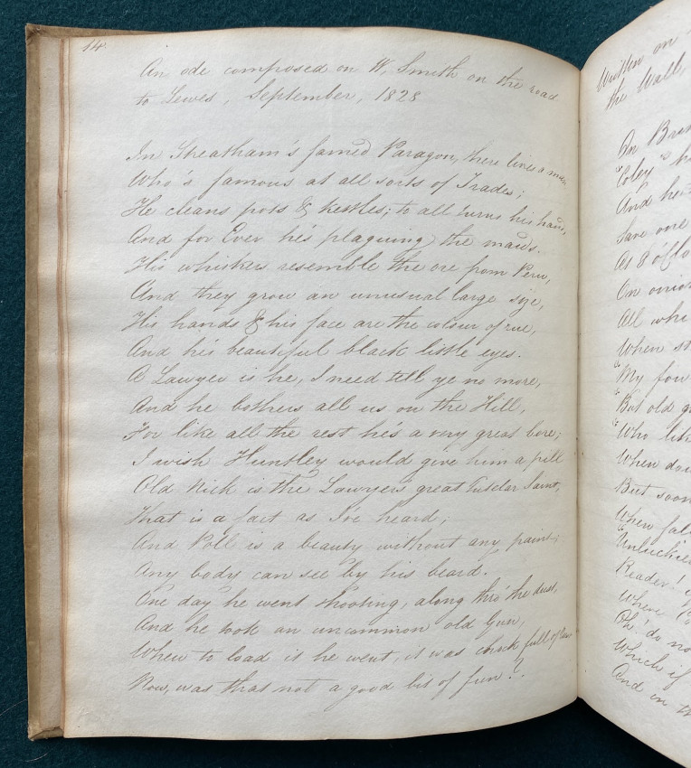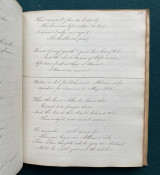 There are approximately 50 separate pieces varying in length from 12 lines to 10 ½ pages. Starting when he was 14, Coles Child writes on a wide range of subjects: ‘Written to commemorate a fight at Mr. Holdens…’; ‘Lines on the Horse..’; ‘Some of the first effusions of my Muse’; ‘On Edward’s falling from a ladder’; ‘Written on breaking my own Nose against the Wall..’; ‘Three anonymous letters to Mary Brittell’; ‘Lines on hearing of the death of Miss Roberts’; ‘On leaving Buxted’; ‘To Susan Palethorpe’; ‘To Mary Brettle [sic], an ugly devil!’; ‘On hearing a young lady say “she had never shed a tear”’; ‘On returning Miss Ann Holden’s portrait’; ‘Epitaph for a monument to the memory of Isaac Field Esq. & his only son Jno. Child Field Child in Yately Church. Written by request’; ‘Youthful Hours. This long rambling poem was written at different periods of my life, commenced about 1831 & concluded in 1833’.