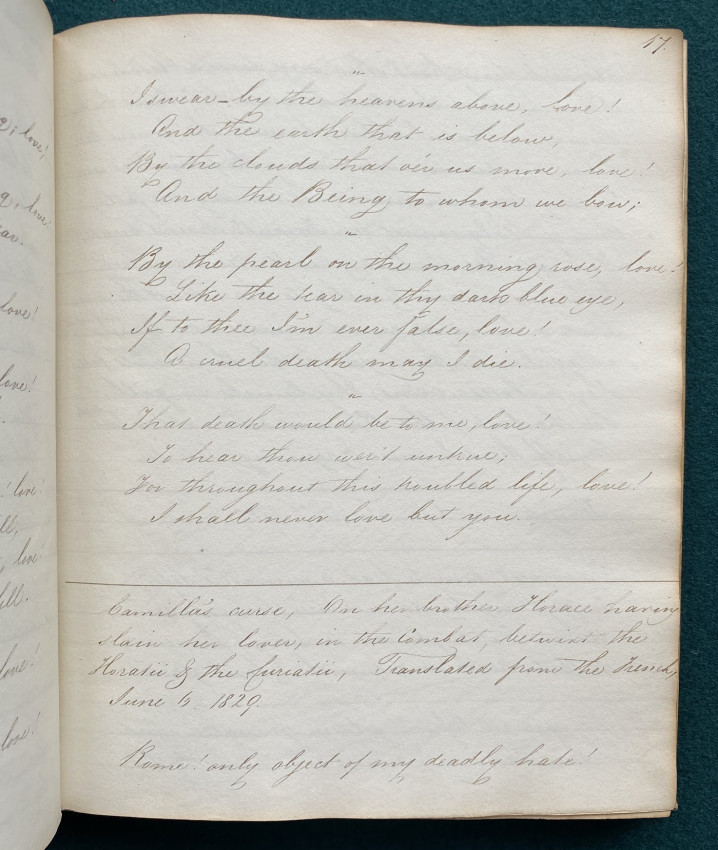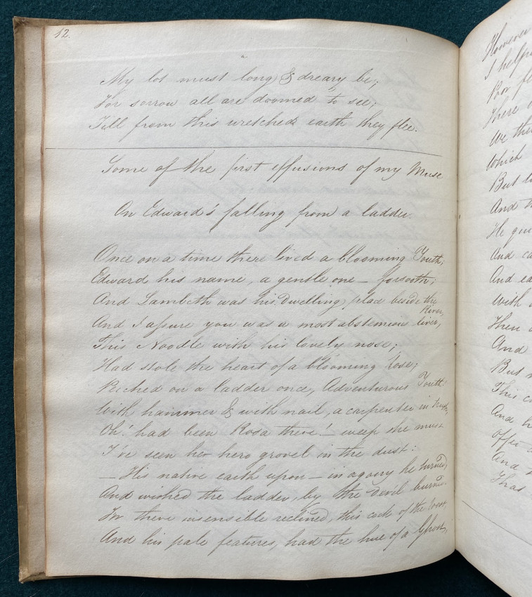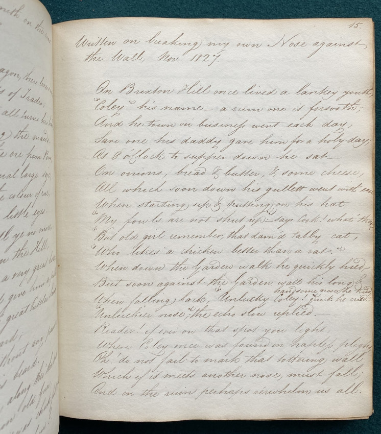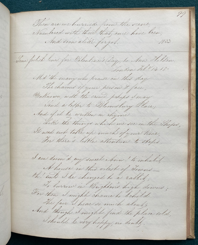 One of the longest ‘titles’ is of a similar length to the poem in precedes: ‘The following lines were written on the occasion of my having one morning (June 7. 1831) peeped into the parlour window at Mr. Holdens, & detected Miss Ann, with her petticoats, as Mathew says “pretty particularly considerably” high, & intently engaged in tying her Garter, she was too much occupied to see me, & I therefore enjoyed a very leisure[ly] survey of one of the prettiest legs in all Christendom, it was an occasion that I could hardly suffer to pass without comment, & the same evening she was presented with these verses, which she thought “ungenteel”’