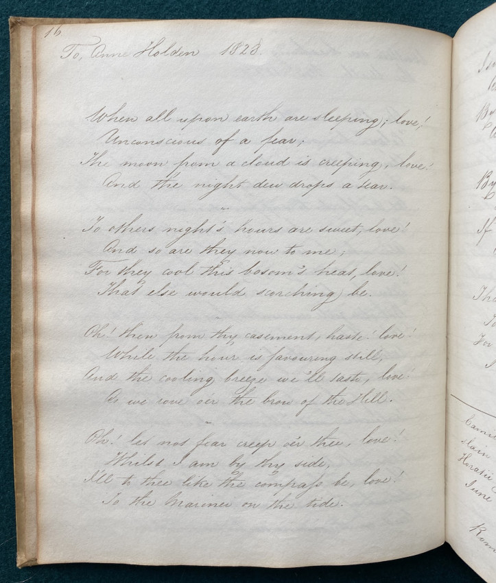 An enthusiastic young man tries his hand at poetry – Anne or Ann Holden features prominently. The final poem suggests a doomed romance.