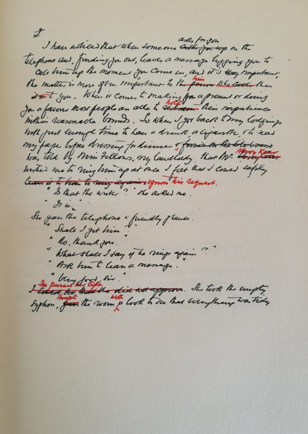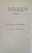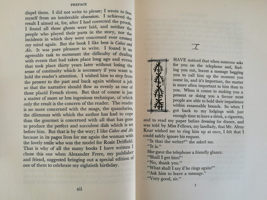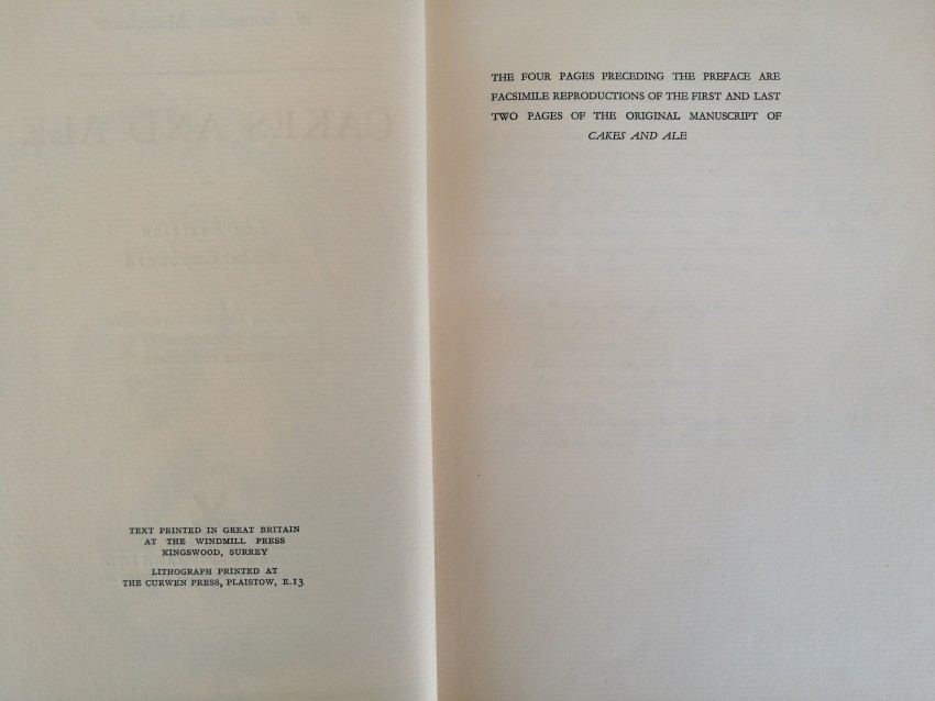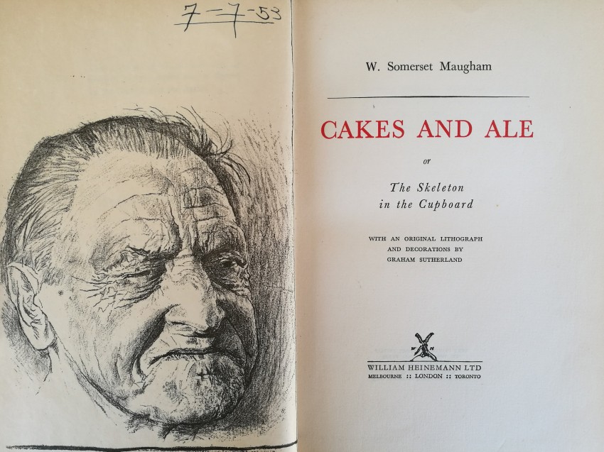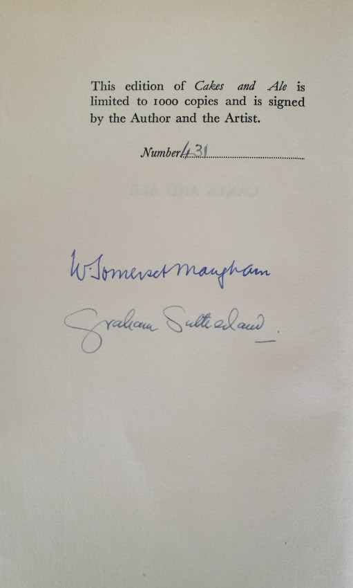 Quarter-bound in cream and black morocco with gilt lettering on a black spine-label and gilt rules to both panels, top page-edge gilt, other edges uncut, plain laid endpapers, limitation certificate: "This edition of Cakes and Ale is limited to 1000 copies and is signed by the Author and Artist - Number 431", original lithograph of the author by the artist (dated in ink "7-7-53") as frontispiece, red-and-black title-page, (4) pp of original manuscript in 2 colours, xii + 255 pp of text on laid paper.