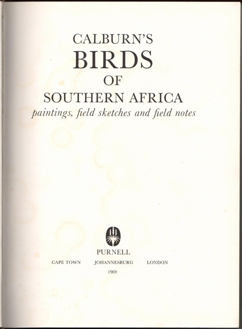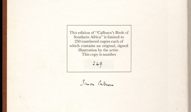 This edition of “Calburn’s Birds of Southern Africa” is limited to 250 numbered copies each of which contains an original, signed illustration by the artist.
