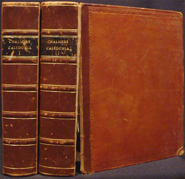 2 volumes of 3, I. iix, 907, (ii errata). II. viii, 1007 pages, large folding map of folding map of North Britain During British and Roman Times (torn at the hinge), 5 plates and plans, 2 folding tables, full calf with black title labels - worn along the edges, front board of volume II detached, marbled edges, signature 4F in volume I heavily foxed, page 705 soiled, some foxing on the preliminary pages but overall the contents are bright.