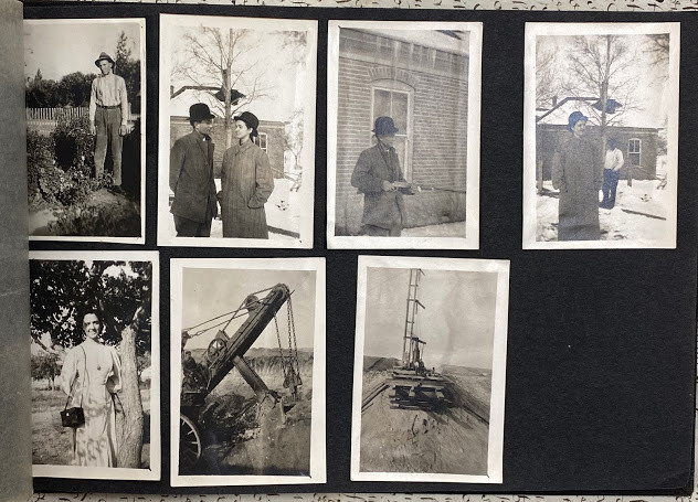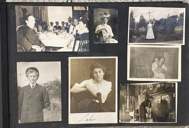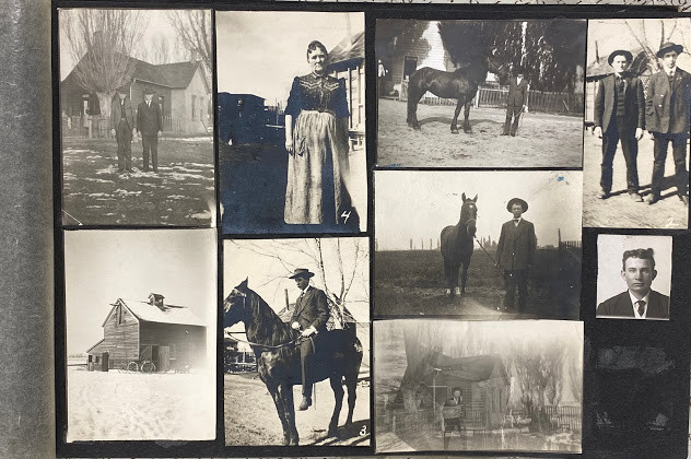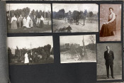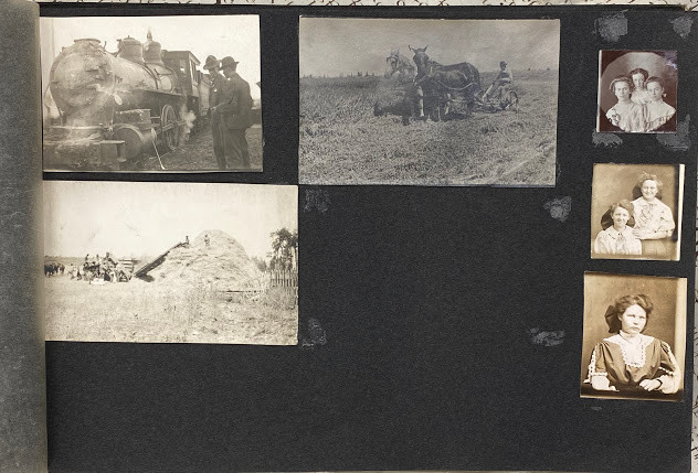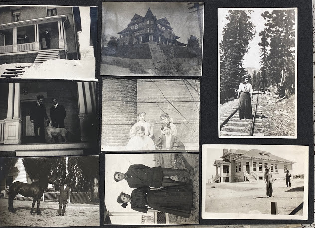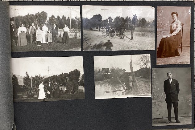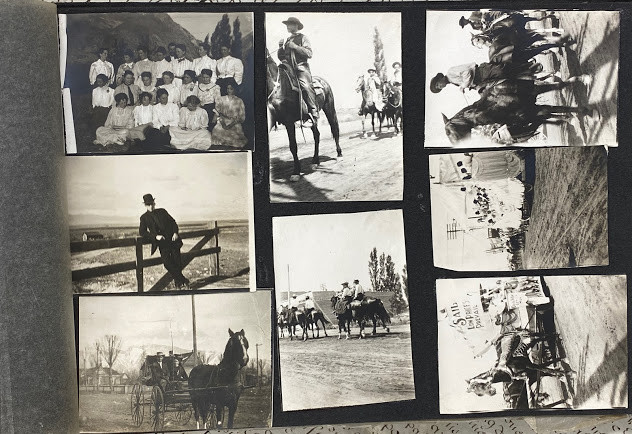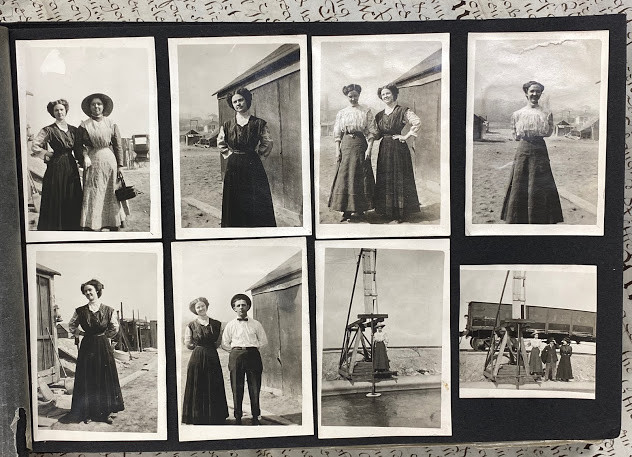 An interesting quite early album – the majority of the images are family snapshots, but, incidentally include mining, an early water-shoot ride, farming, steam trains, a parade with floats, what is probably a 4th July construct: a painted-canvas clad U.S.S Utah on a pond in a park; and two images of the devastation in San Jose caused by the 18th April 1906 earthquake.