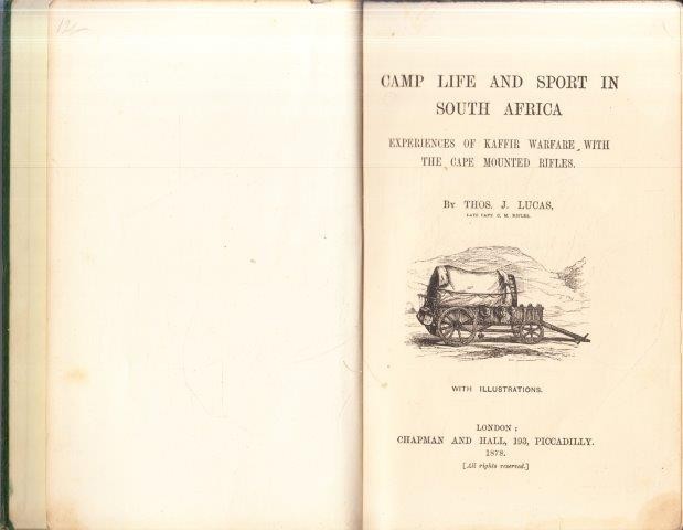 Dictionary of South African Biography vol. 3 pages 544-5: Arriving in South Africa in 1850, Lucas joined the Cape Mounted Rifles and took part in the Eighth Frontier War of 1850-53. He next accompanied Sir George Clerk as commander of a mounted escort to Bloemfontein, to arrange for the withdrawal of the British from the Orange River Sovereignty. He describes the capital of the later Orange Free State 'As desolate a place as it is possible to imagine'. He describes many hunting trips and the hardships suffered by game during periods of continuous drought.