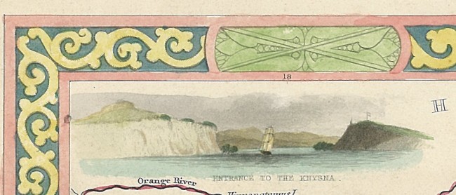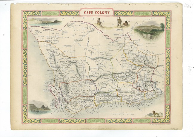 Robert Montgomery Martin, the editor of the atlas, was an author and civil servant who visited the Cape Colony in 1823. Although this map usually is attributed to John Tallis (1815/6 – 1876), he was a publisher and not a cartographer. The map was designed, drawn and engraved on a steel plate by John Rapkin (1813-1899); Henry Warren drew and Henry Bond engraved the attractive, coloured vignettes of Knysna, Klaarwater (Griqua Town, a mission station), Graham’s Town (a border outpost), Cape Town and a lion. The vignette of Cape town shows a flag pole atop Signal Hill – two years later this was replaced by a time-ball – the falling of the ball was triggered by telegraph at 1pm Cape Time by the Royal Observatory; the falling of the ball enabled ships’ navigators to set their chronometers used for determining longitude. The vignette of Knysna, with a sailing ship negotiating the Heads, reminds us that it was an active port at the time.