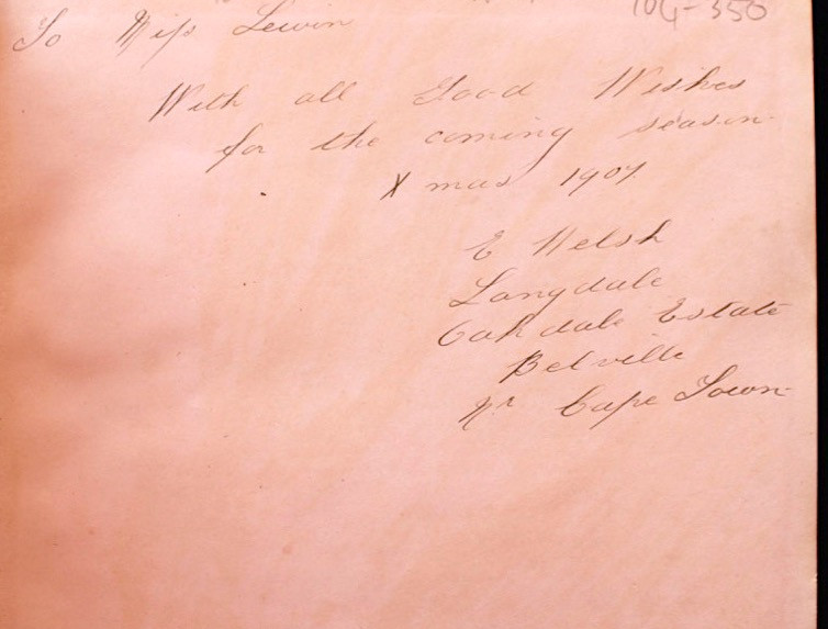 Neat local & contemporary gift inscription "Langdale Estate, Oakdale Estate, Bellville, Cape Town" dated "Xmas 1907" on the front endpaper.