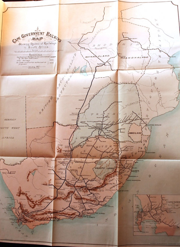 viii + 316pp. Illustrations in profusion. Fold-out "Cape Government Railways Map" at rear showing routes of railways in South Africa.