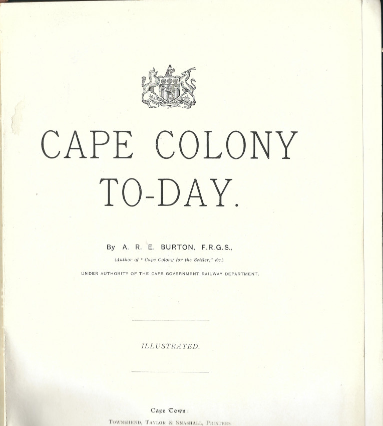 Cape Govt. Railway Dept., Cape Town. 1st Edition. 1907. Very Good burgundy cloth lightly faded in parts. 1st Edition. 315pp, illustrated with black and white ills.. Folding Cape Govt Railways map. Black lettered boards with insignia on front board. Internally very good.