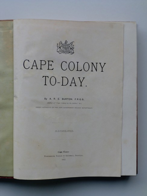 Condition: contents very good, clean, large colour fold-out map at rear very good, front hinge opposite portrait frontispiece is splitting, boards discoloured due to fading/age, with rear board now mottled with purplish patches (probably original colour of boards).