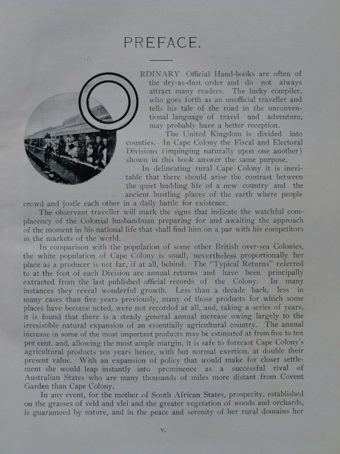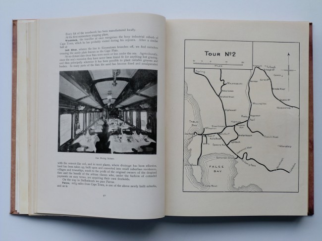 TOURS: -First Tour:- Cape Town and Environs; -Second Tour:- Cape Town to Caledon and Ceres; -Third Tour:- Saldanha Bay, Eendekuil, Namaqualand, Port Nolloth, Worcester, Mossel Bay, George; -Fourth Tour:- George to Knysna, Plettenberg Bay, Assegai Bosch, and Avontuur to Port Elizabeth; -Fifth Tour:- Uitenhage; -Sixth Tour:- Aliwal North via Stormberg and Rosemead to Cradock, Somerset East, Alicedale; -Seventh Tour:- Port Alfred to Alice, Hogsback, and East London, -Eighth Tour:- East London, Butterworth, Queenstown, Kaffraria; -Ninth Tour:- Queenstown to De Aar via Nauwpoort, Britstown, Prieska, Hope Town, Kimberley, Barkly West, Mafeking; -Tenth Tour:- A Trip To The Victoria Falls (Kimberley-Mafeking-Bulawayo).