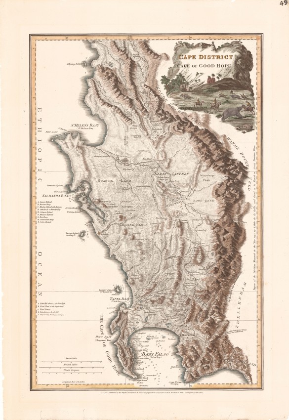 This map is fascinating because it is a cartographic version of an historical novel. The map includes some of the places visited by Simon van der Stel’s party in its journey into Namaqualand a century earlier. It features the names of some of the first settlers in the area between Table Bay and the Hottentots Holland Mountains (ca. 1675 – 1705). It shows the network of wagon roads in the colony in the 18th century; the routes of a number of these roads are still followed by modern arterial roads. Saldanha Bay and the coastline to St. Helena Bay were copied from De la Caille and famous French Hydrographer d’Après de Mannevillette ... and is not accurate.